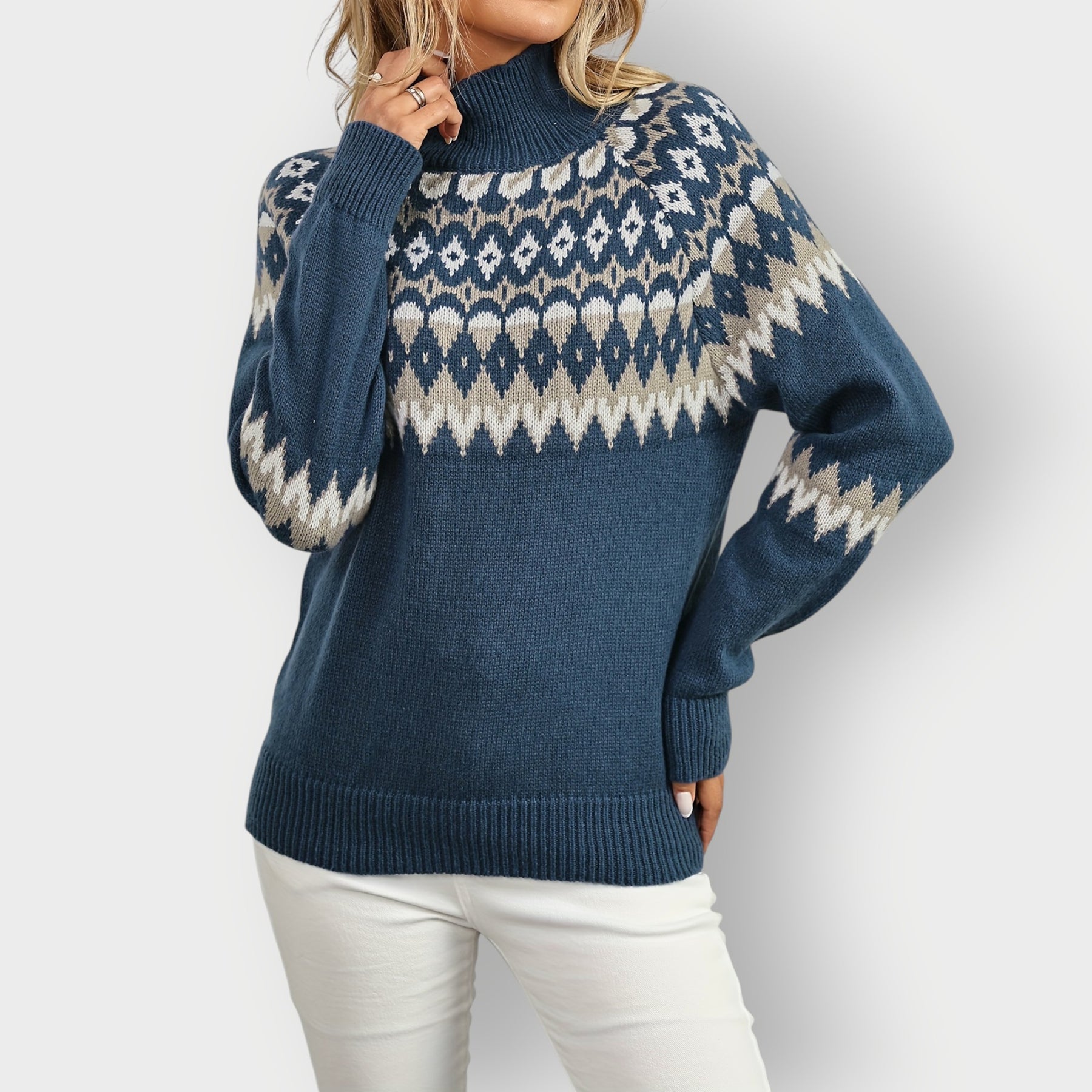 The Lexie Sweater features a beautifully detailed Nordic-inspired pattern in calming winter tones, giving it a timeless and elegant look. With its soft high neckline, relaxed silhouette, and chic patterned yoke, Lexie is the perfect companion for crisp days, casual outings, or warm evenings inside. Pair it with jeans, trousers, or a cozy coat - Lexie adds effortless style wherever you go.